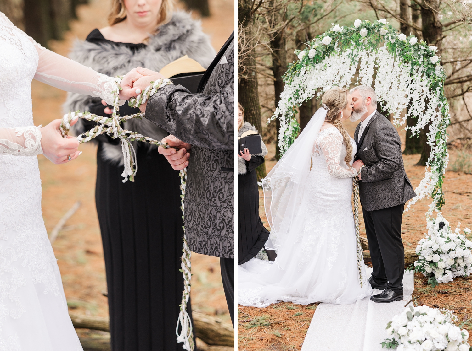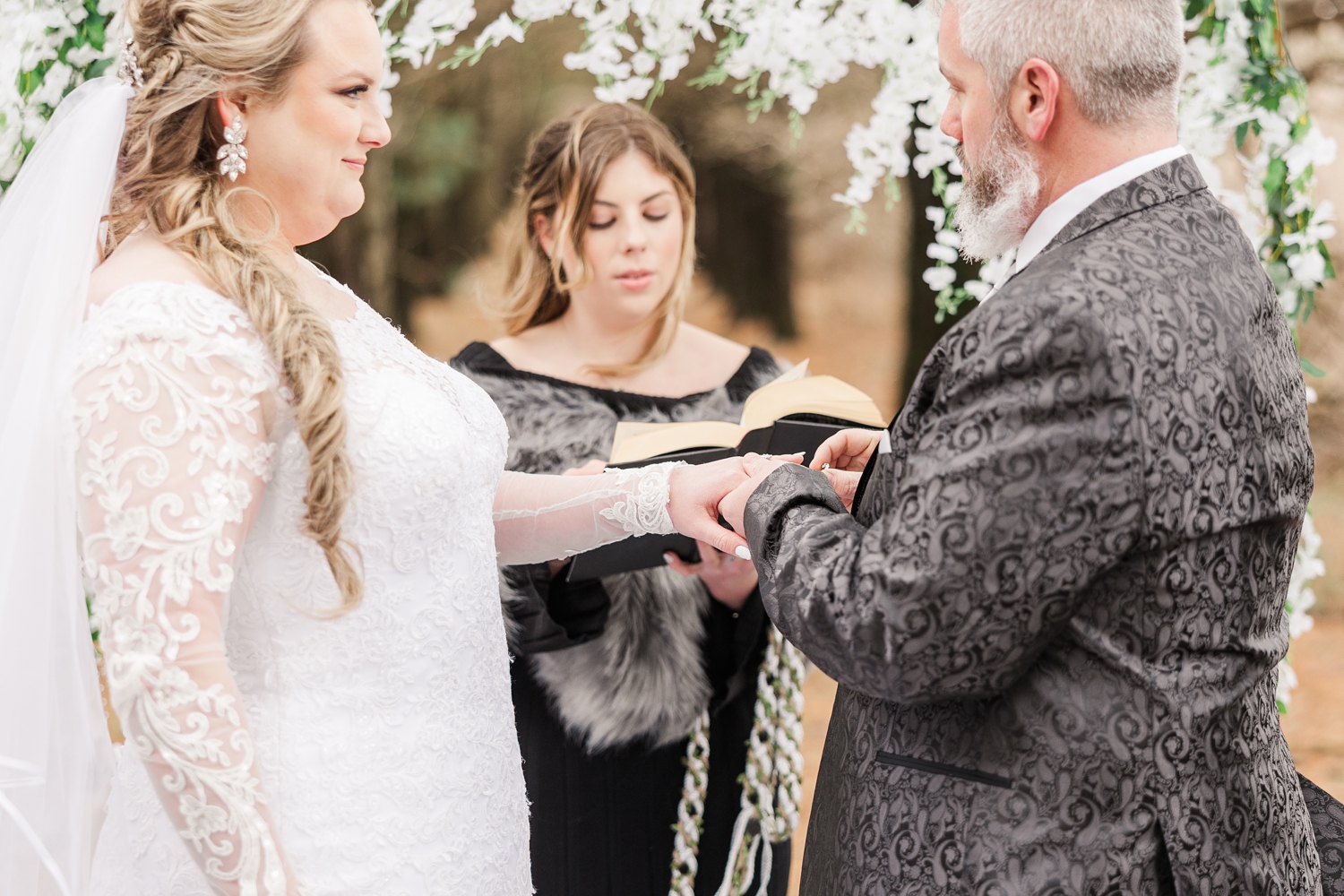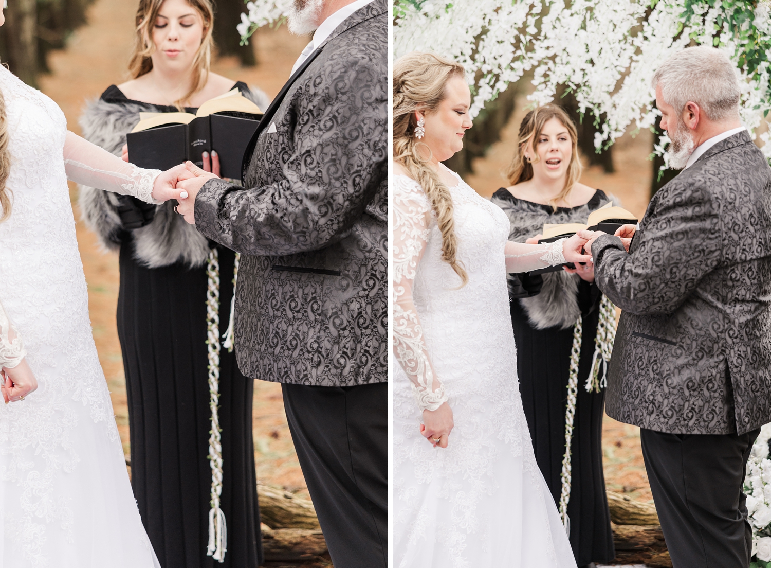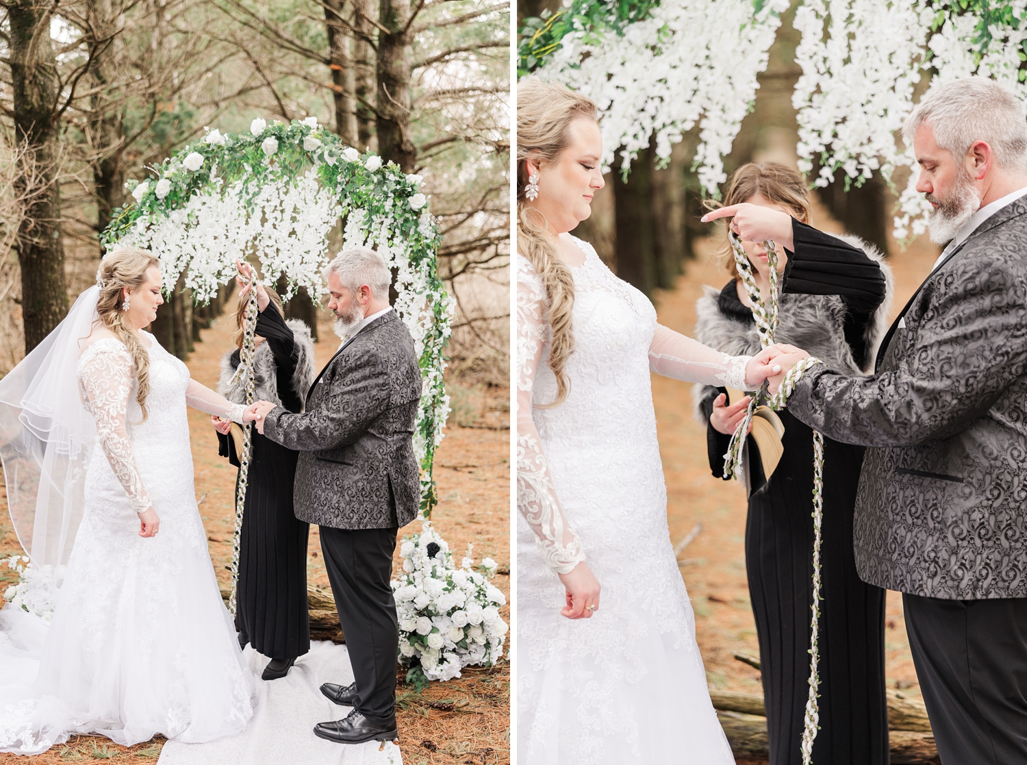 It was a cold day, with a sharp, bone-chilling breeze and soft snow flurries drifting through the air. But somehow, that only added to the atmosphere. It felt still and peaceful, like the world had slowed down just for them in that brief moment. Their ceremony was heartfelt and intentional, even incorporating a rope-tying ritual that symbolized their lives being woven together.