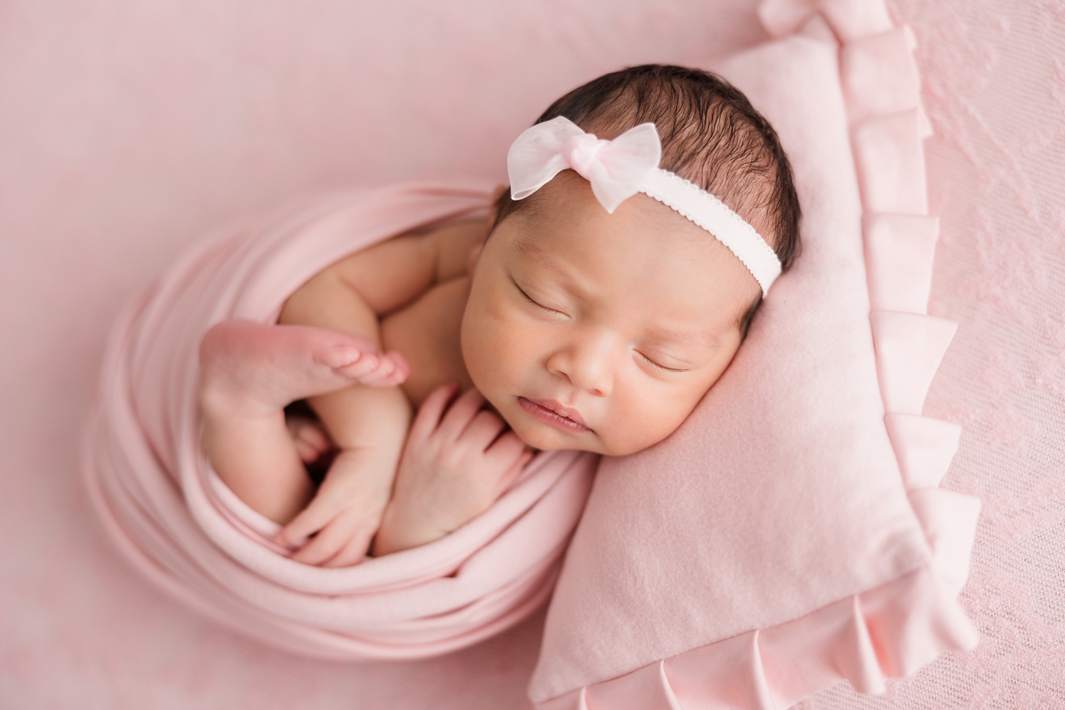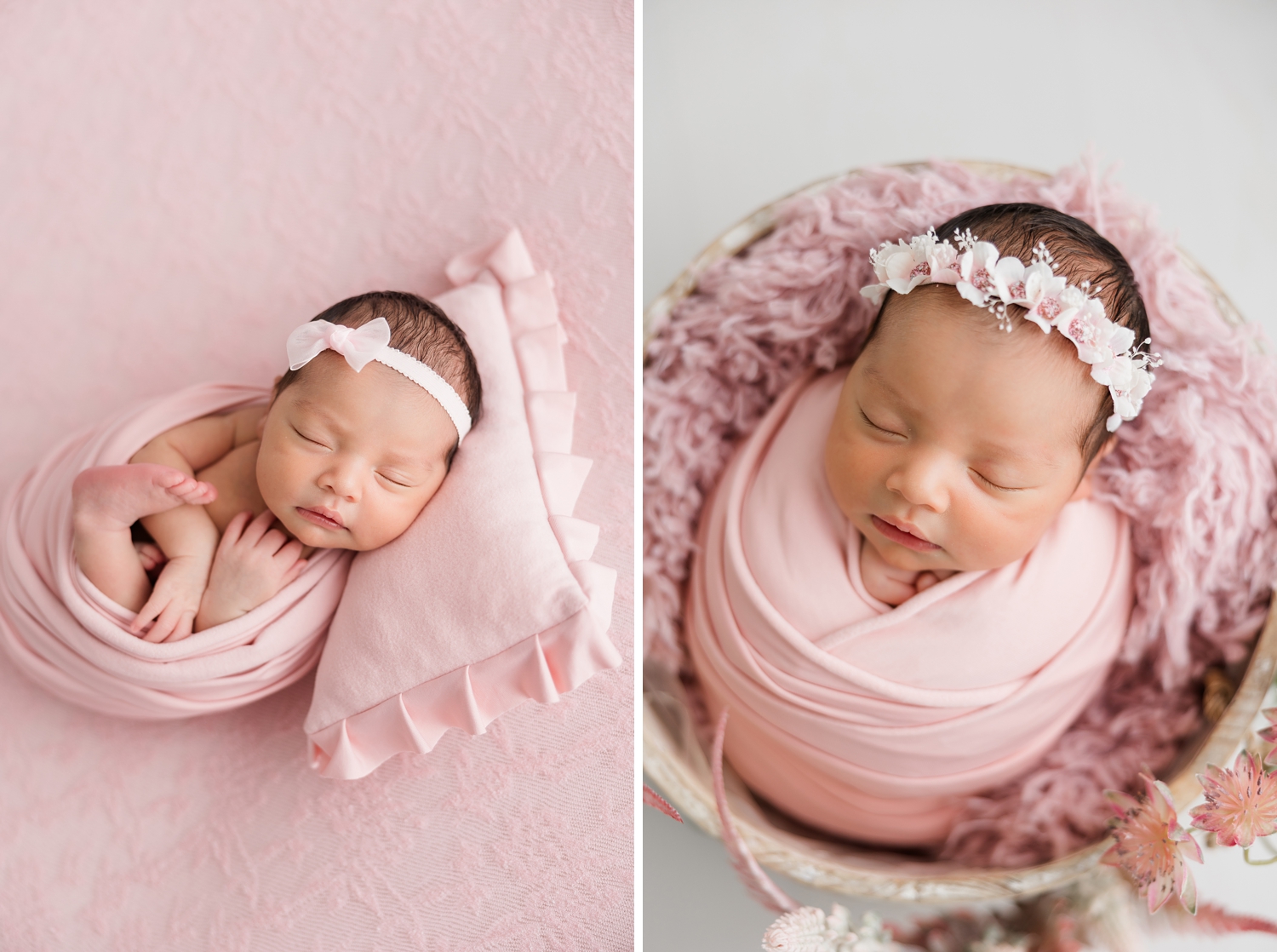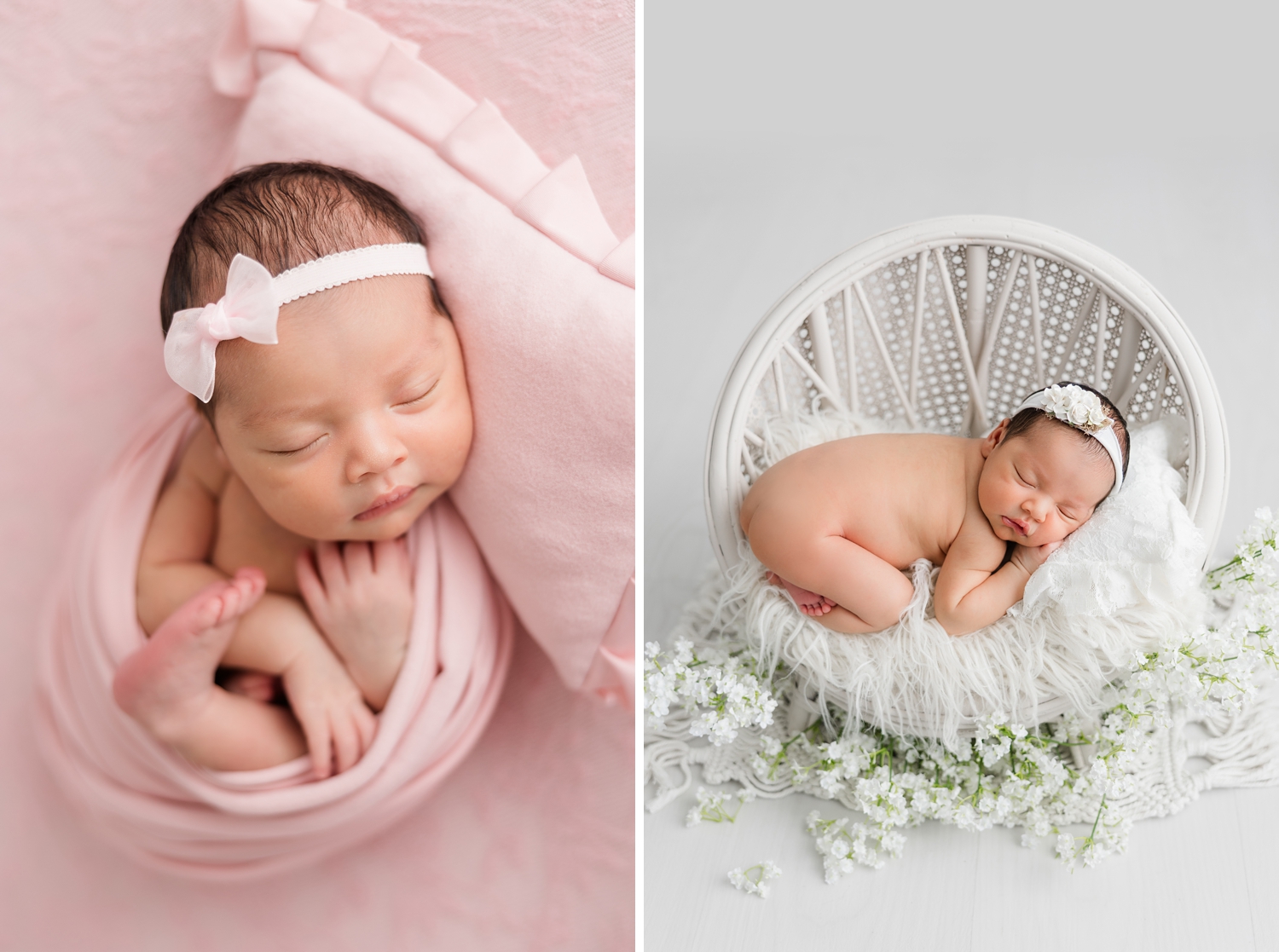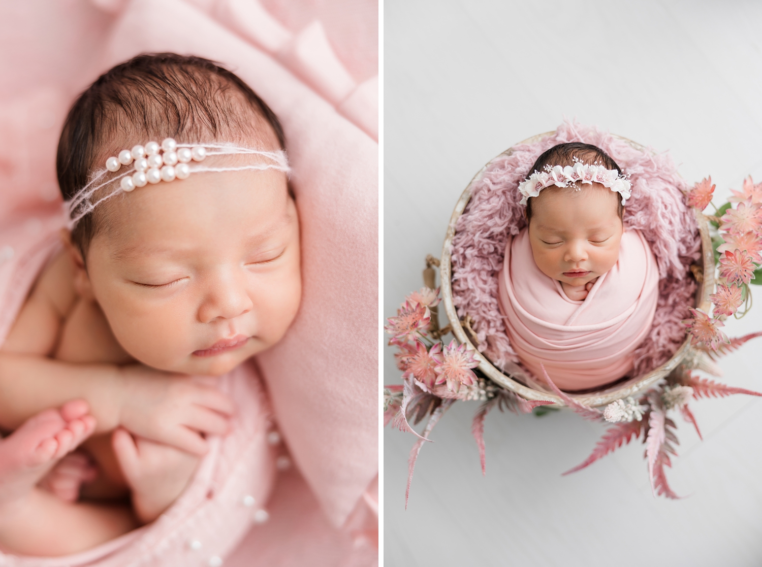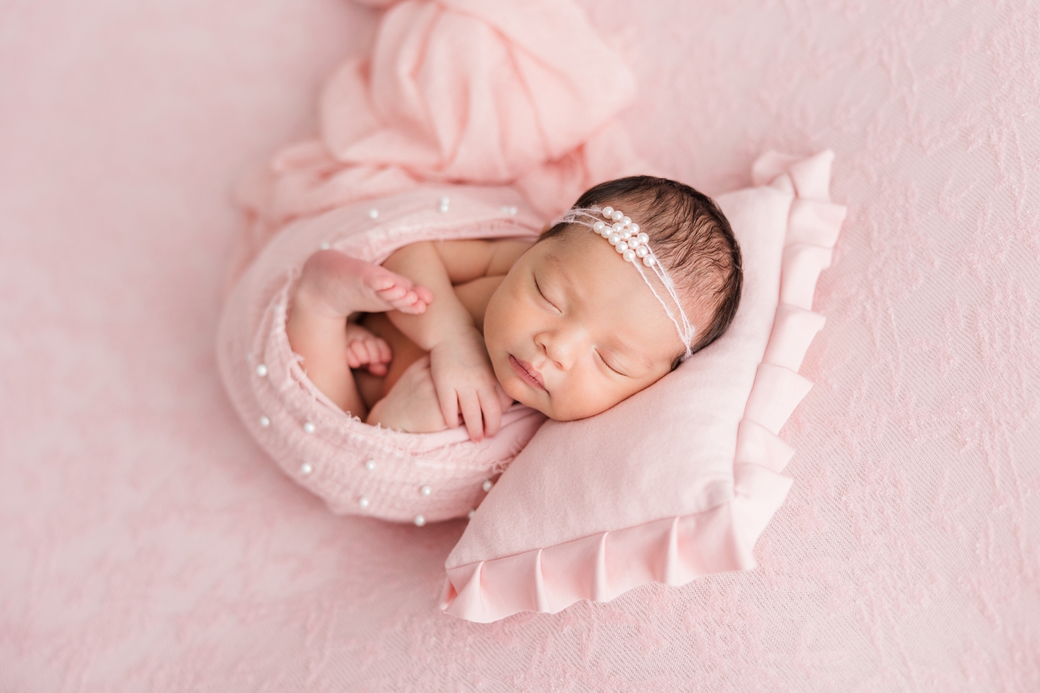 We styled Zayla’s session in soft pinks and whites, a timeless combination that complemented her perfectly. Her dark hair and beautiful complexion made every setup feel even more striking, while still keeping that soft, delicate feel that my newborn sessions are known for. And she did absolutely amazing! Calm, content, and an absolute dream to photograph from start to finish.