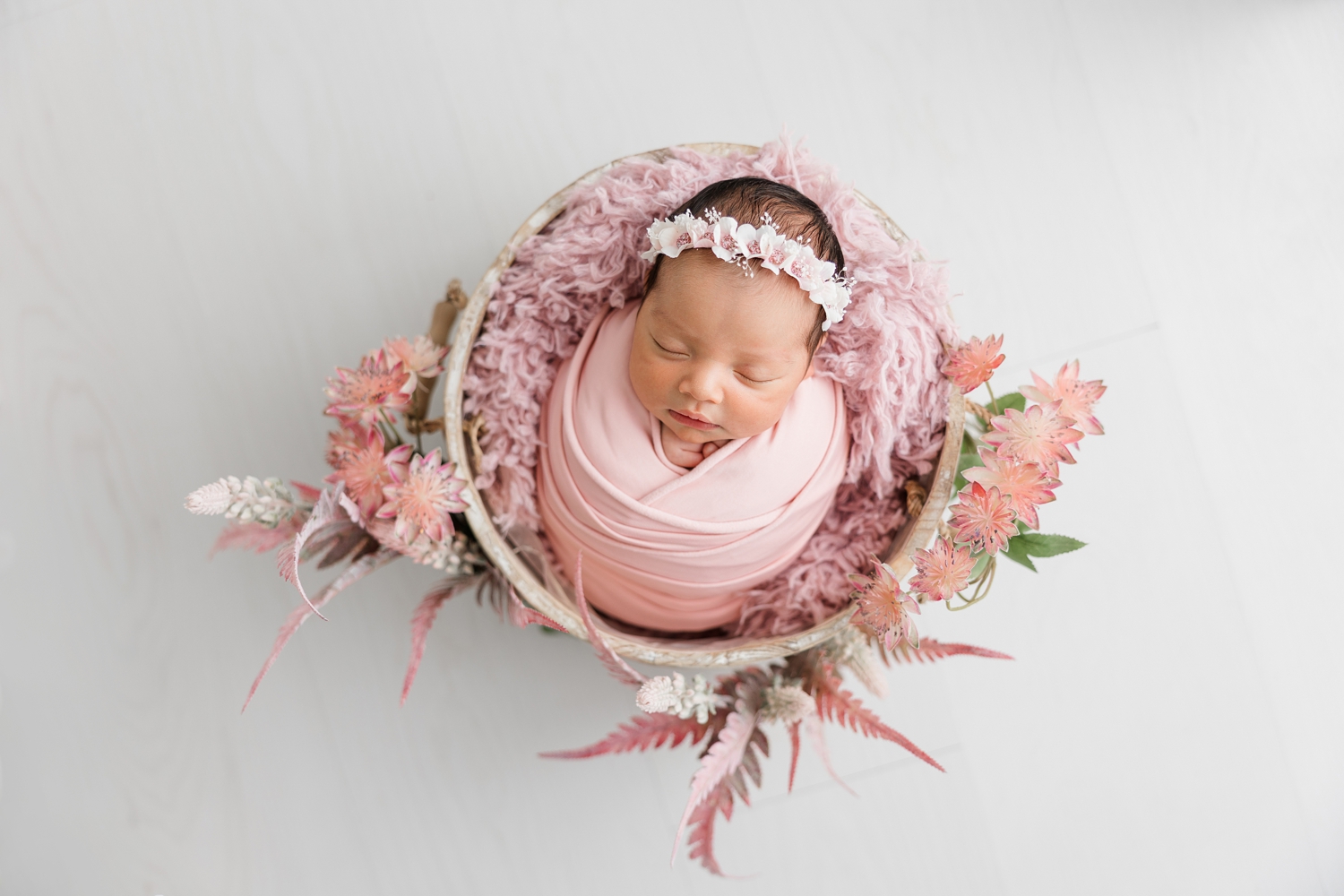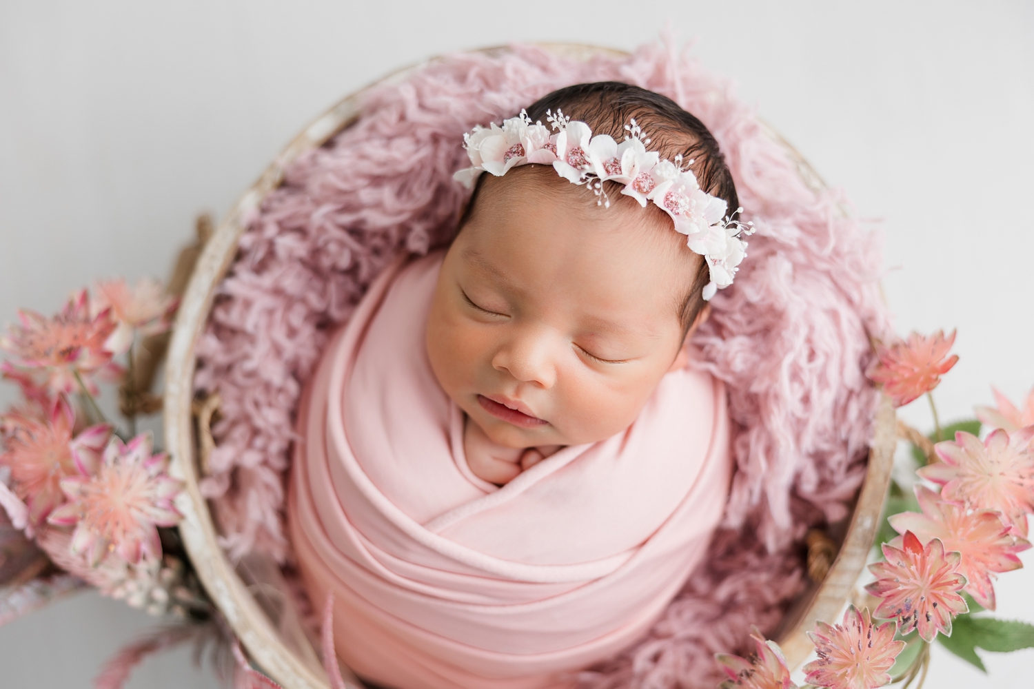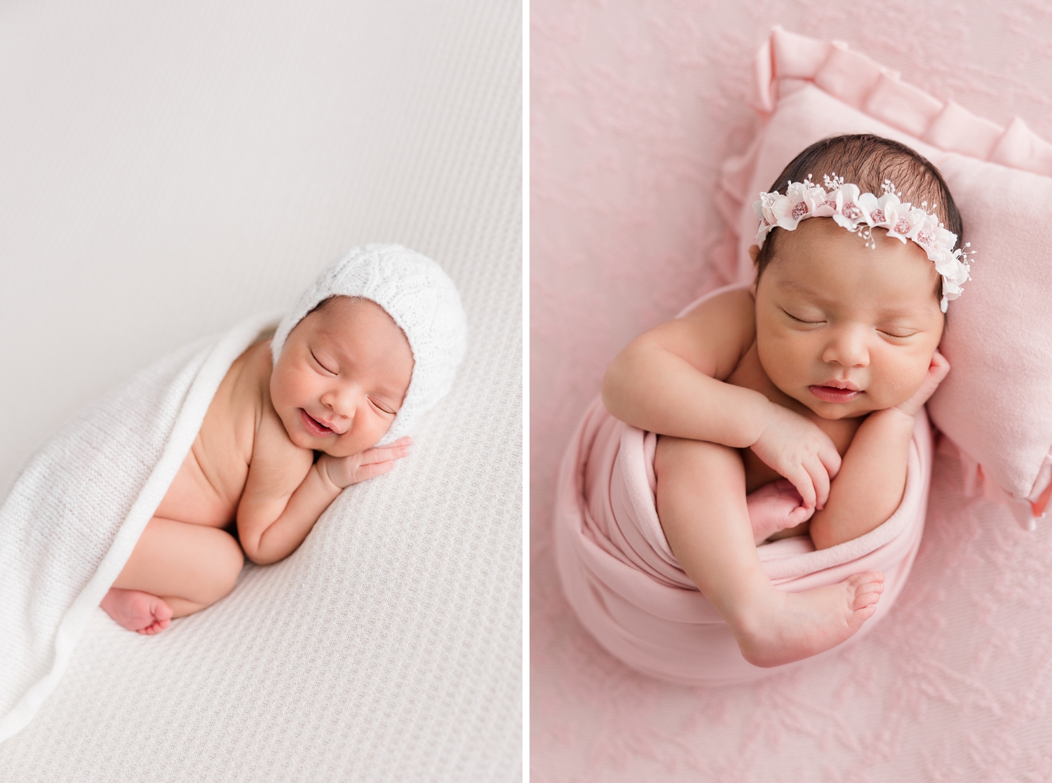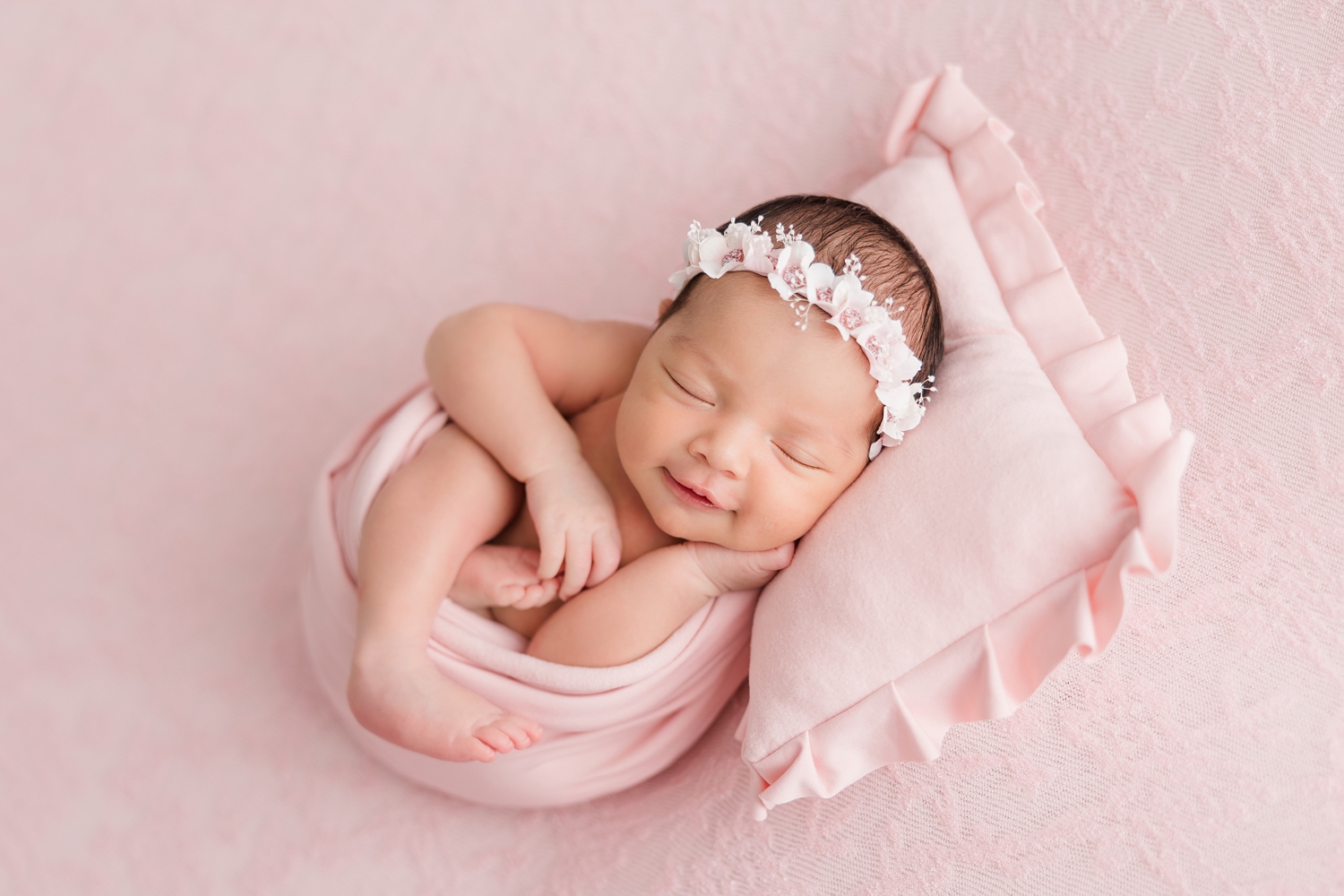 We styled Zayla’s session in soft pinks and whites, a timeless combination that complemented her perfectly. Her dark hair and beautiful complexion made every setup feel even more striking, while still keeping that soft, delicate feel that my newborn sessions are known for. And she did absolutely amazing! Calm, content, and an absolute dream to photograph from start to finish.